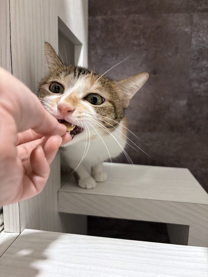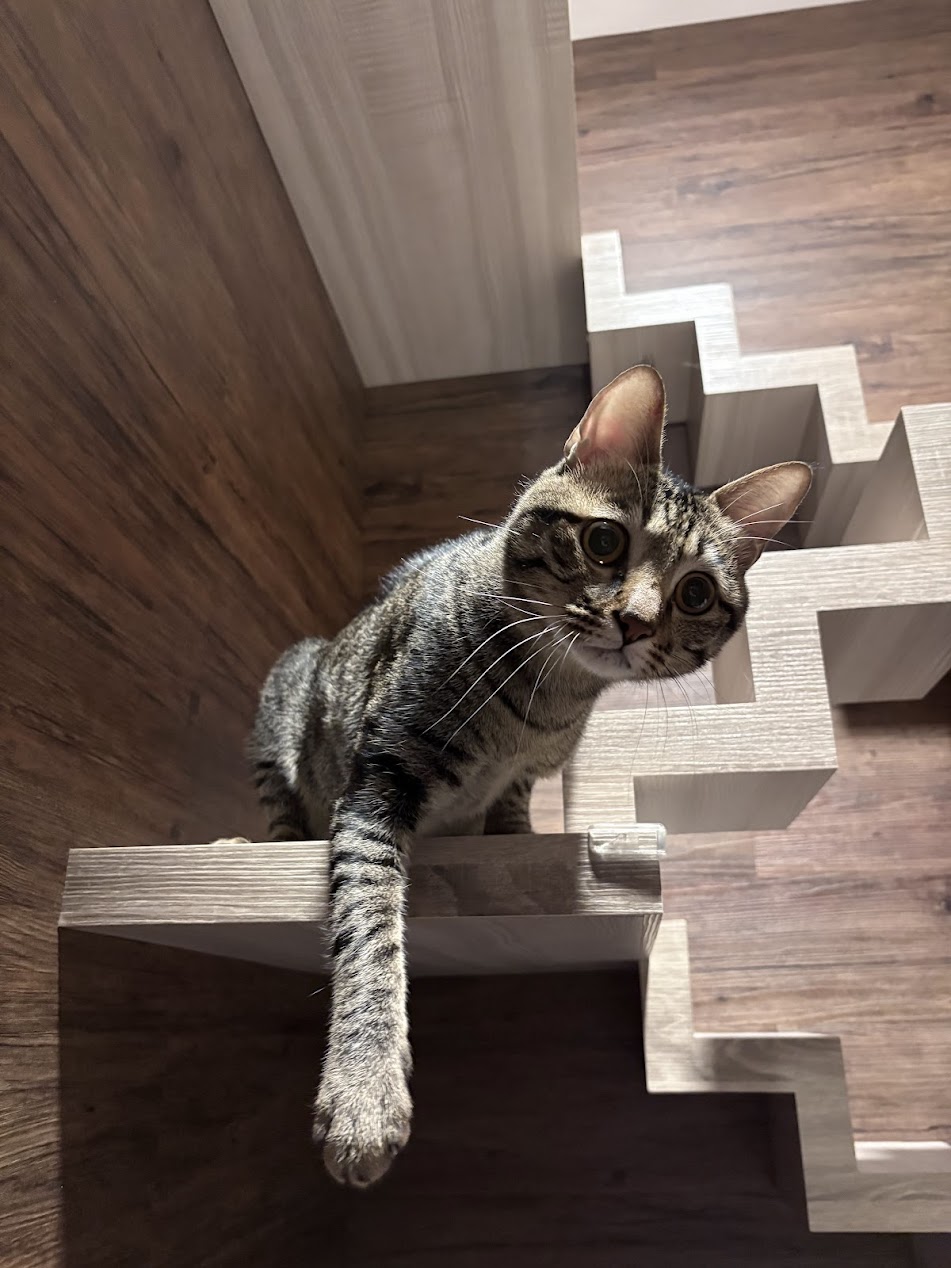 害羞三花小女生「美花」。 2026.3.3 還記得美花第一次入住貓森旅時,處在一個比較害羞、食慾也不好的狀態,照護員姊姊當時為了鼓勵她上廁所,直接把砂盆移動到天空步道上,終於成功讓她鼓起勇氣進砂盆尿尿。 第二次入住的美花對貓森旅還有些印象,所以